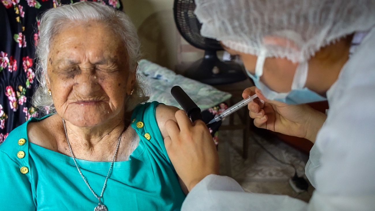Maria de Nazaré Magalhães, de 88 anos, recebendo a primeira dose da vacina CoronaVac.