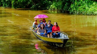 Para se chegar em algumas residências foi preciso ir de barco. Na foto, a Secretária de Educação fazendo a entrega para dois alunos que moram às margens do Rio Taiassuí.