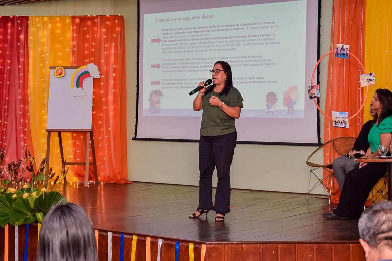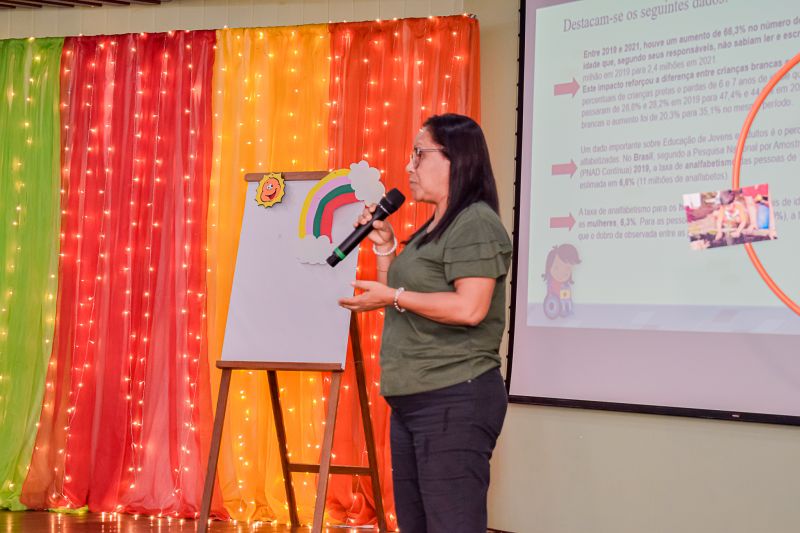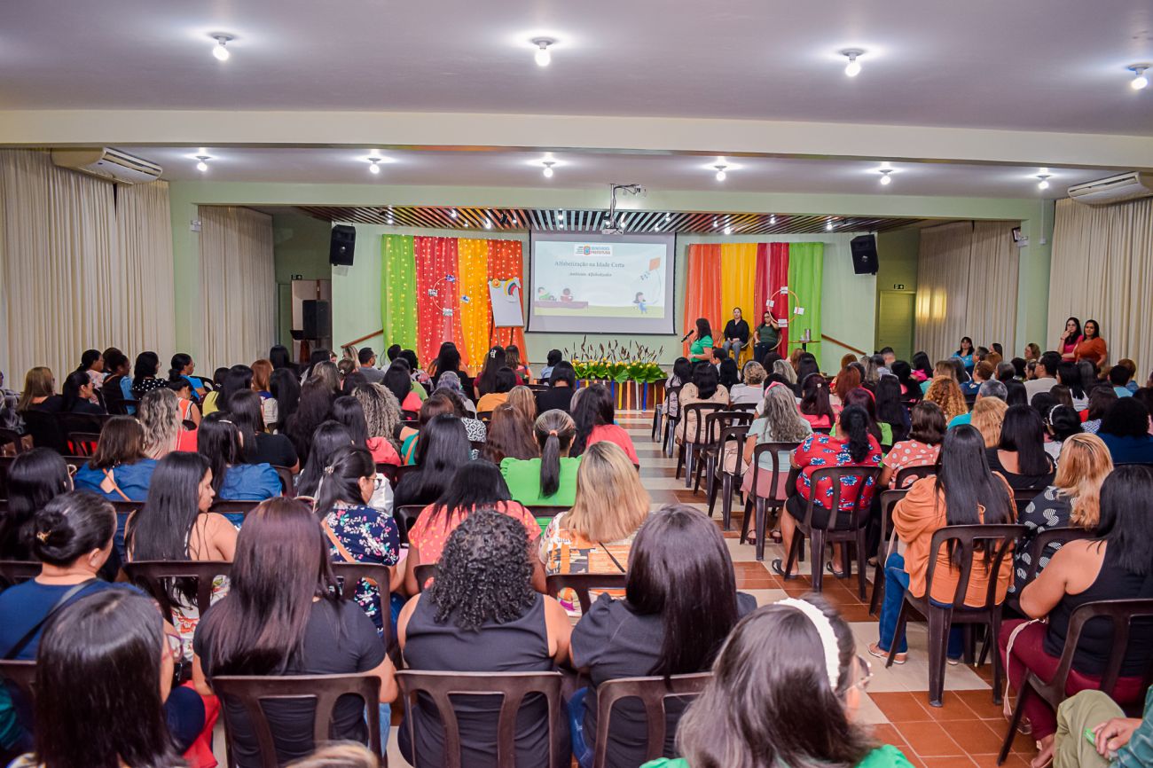 À tarde o encontro foi com os professores do 1º ao 4º ano e Educação de Jovens e Adultos, com o tema “Alfabetização na idade certa”, ministrado pelas professoras, Mara Simone e Rita de Cássia, sobre a importância de alfabetizar os alunos na idade certa para que eles consigam seguir a vida com mais segurança, sucesso e entusiasmo. De acordo com a Base Nacional Comum Curricular (BNCC), todos os alunos, entre 7 e 8 anos, deveriam dominar as habilidades de leitura e escrita.