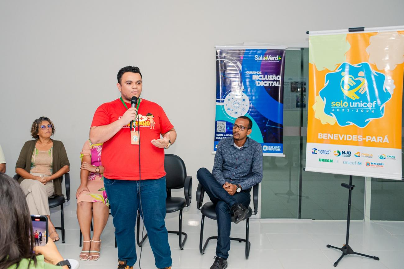 O articulador do Selo UNICEF Benevides, Miguel Sepêda, fez uma explanação sobre a importância do fortalecimento de políticas públicas municipais voltadas para as crianças e para os adolescentes, proposta que deve se destacar nas cidades onde o Selo UNICEF está presente.