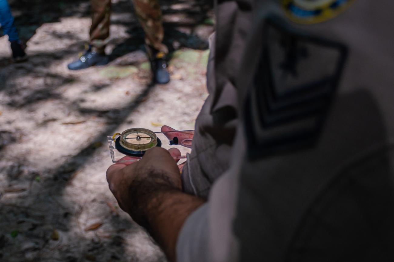 Na última aula prática, os participantes, orientados pela equipe do Corpo de Bombeiros, percorreram trilha no meio da mata onde receberam informações sobre o uso de meios de orientação como a bússola, leitura de mapa, o sol e relógio analógico.