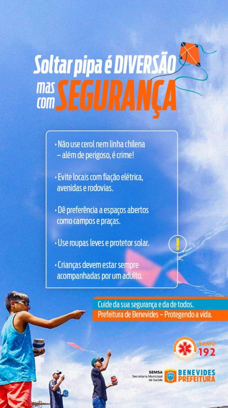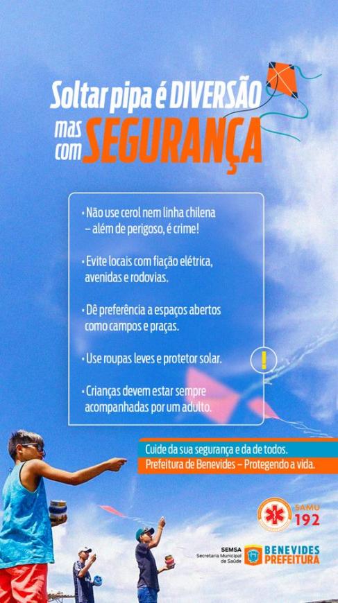 A chegada do verão intensifica uma das brincadeiras mais tradicionais entre crianças, adolescentes e até adultos em Benevides: o empinar pipas pelos céus do município. Pensando na segurança da população e na prevenção de acidentes graves, a Prefeitura de Benevides, por meio da Secretaria Municipal de Saúde e do Serviço de Atendimento Móvel de Urgência – SAMU 192, lança uma campanha educativa com foco em cuidados e responsabilidade.