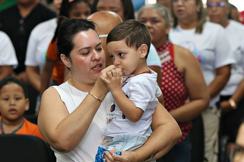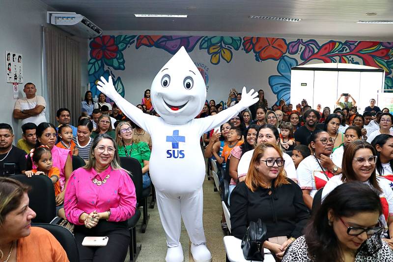 A abertura da Semana do Bebê 2025 teve apresentação do coral das crianças do CRAS- Flores e contou com a presença do personagem Zé Gotinha, que simboliza o cuidado com a vacinação das crianças.