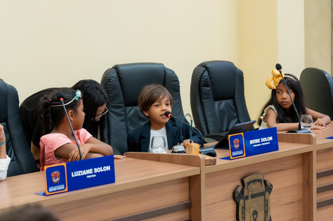 Nesta segunda-feira (20/10) a Câmara Municipal de Benevides se transformou em um espaço de cidadania e sonhos durante a Sessão Solene do projeto "Criança Prefeita por um Dia". Crianças eleitas por meio de votação nas escolas municipais assumiram simbolicamente as cadeiras de prefeita, vice-prefeita, vereadores e secretários municipais.