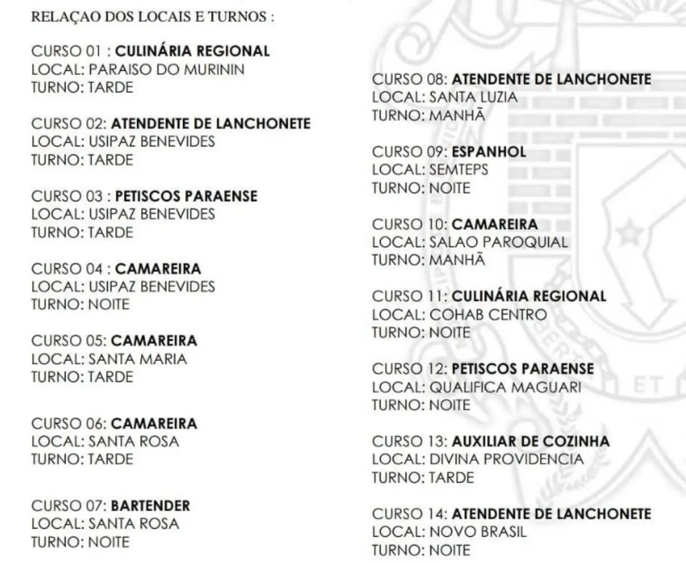 Para garantir o acesso à população de diversas áreas, as aulas serão realizadas em várias localidades do município, com horários e turnos variados: