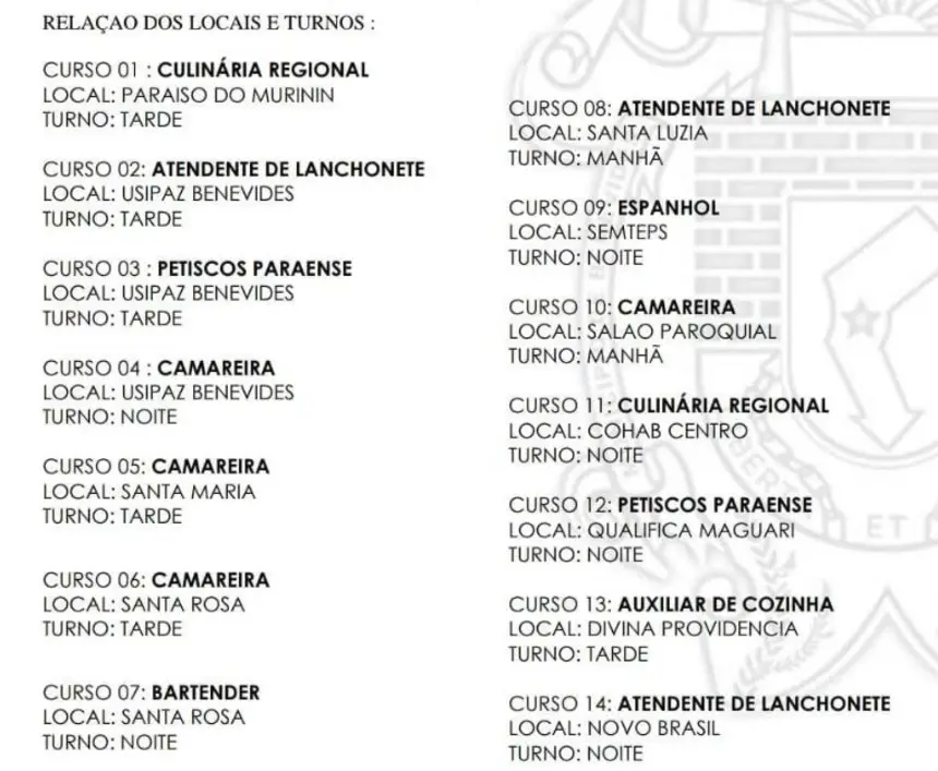 Os cursos foram estrategicamente escolhidos para atender à demanda crescente do setor de turismo e serviços de Benevides, preparando a mão de obra local para atuar em diversas áreas da hotelaria e gastronomia. A oferta de cursos inclui: