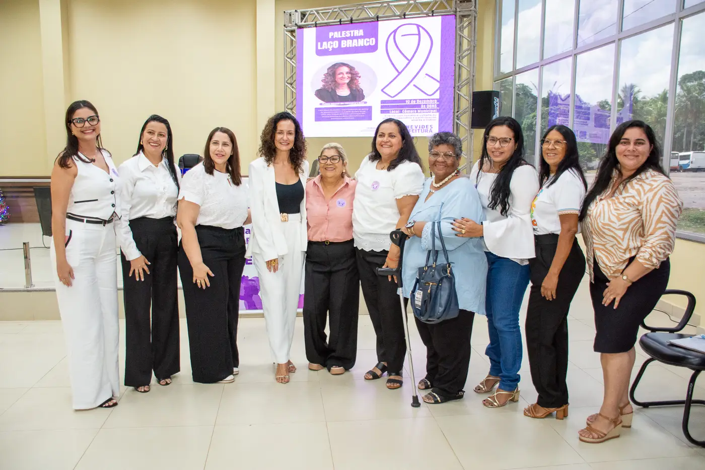 A campanha também contou com momentos de lazer e reflexão, como sessões de cinema temáticas, encontros com grupos de mulheres e ações de cidadania com a oferta de serviços essenciais. Um destaque importante foi o engajamento masculino por meio da Campanha Laço Branco, que promoveu atividades reflexivas com servidores homens sobre o seu papel no fim da violência. O encerramento foi marcado pela energia de um aulão de zumba, promovendo integração e saúde.
