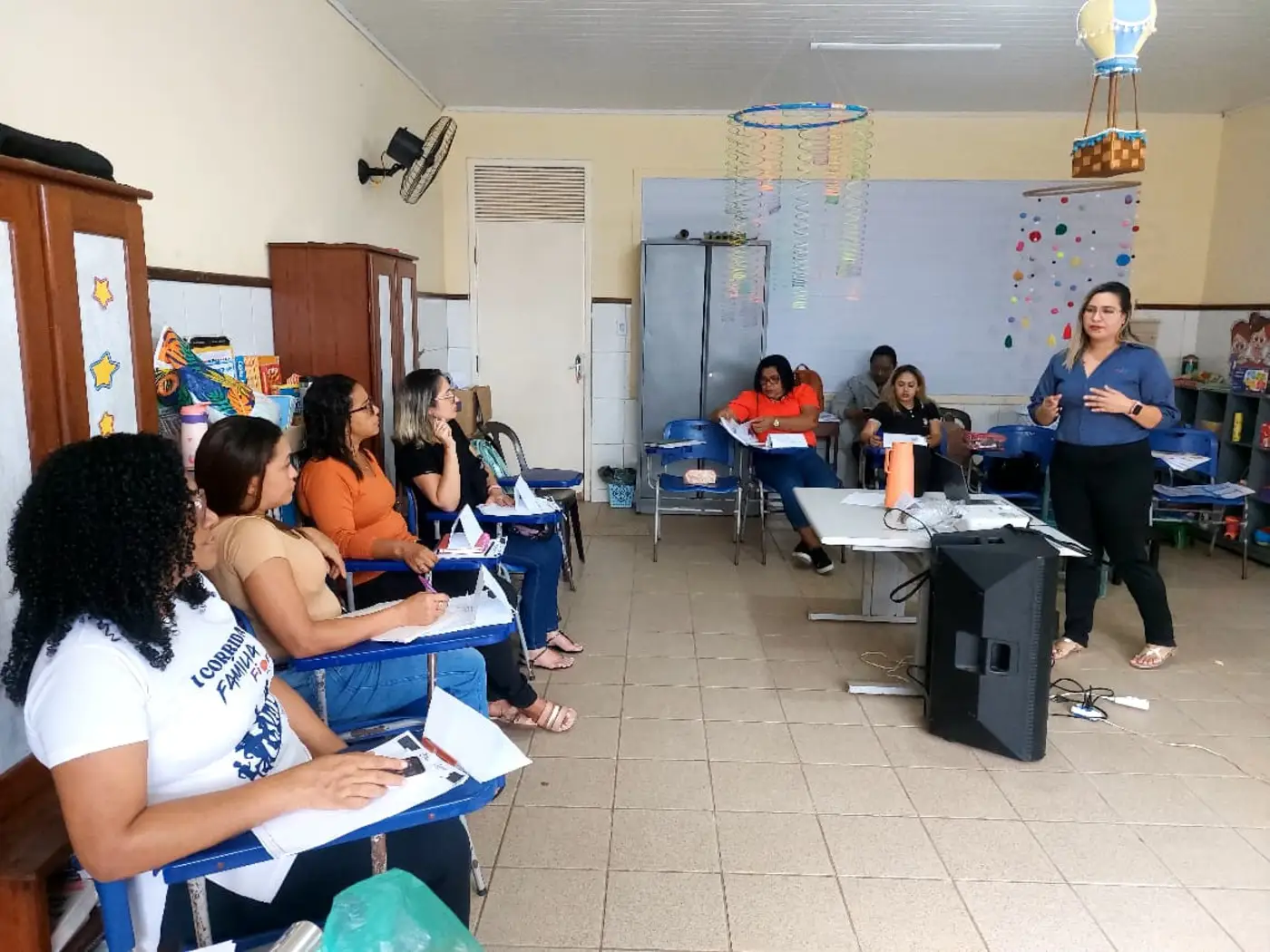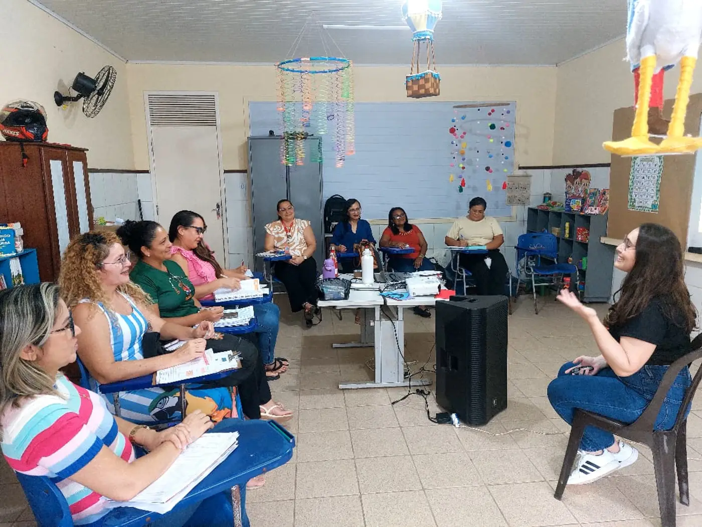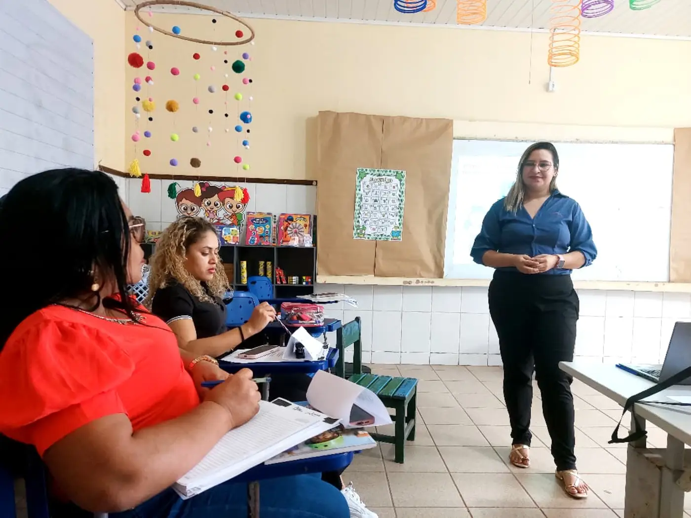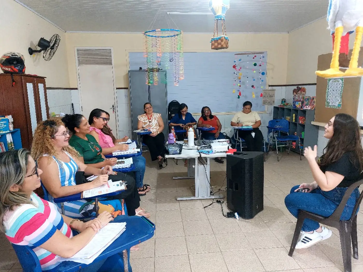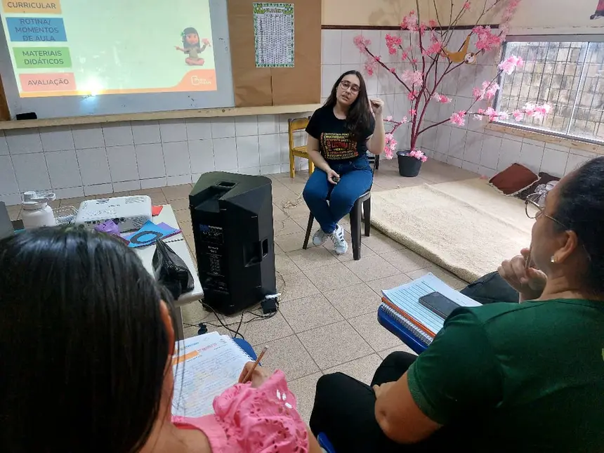 As formadoras abordaram temas a respeito da Educação Antirracista, evidenciando a relevância de trabalhar os conteúdos em sala de aula numa perspectiva de combate ao preconceito étnico-racial, fortalecendo o respeito e a empatia no cotidiano das crianças, a fim de formar indivíduos que praticam a equidade entre seus pares.