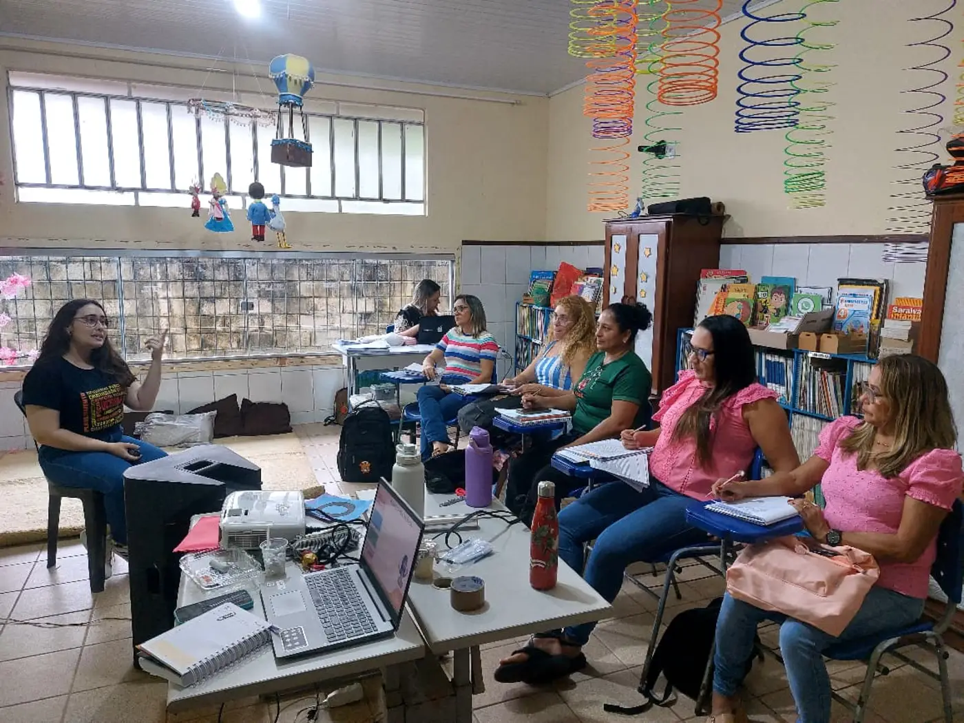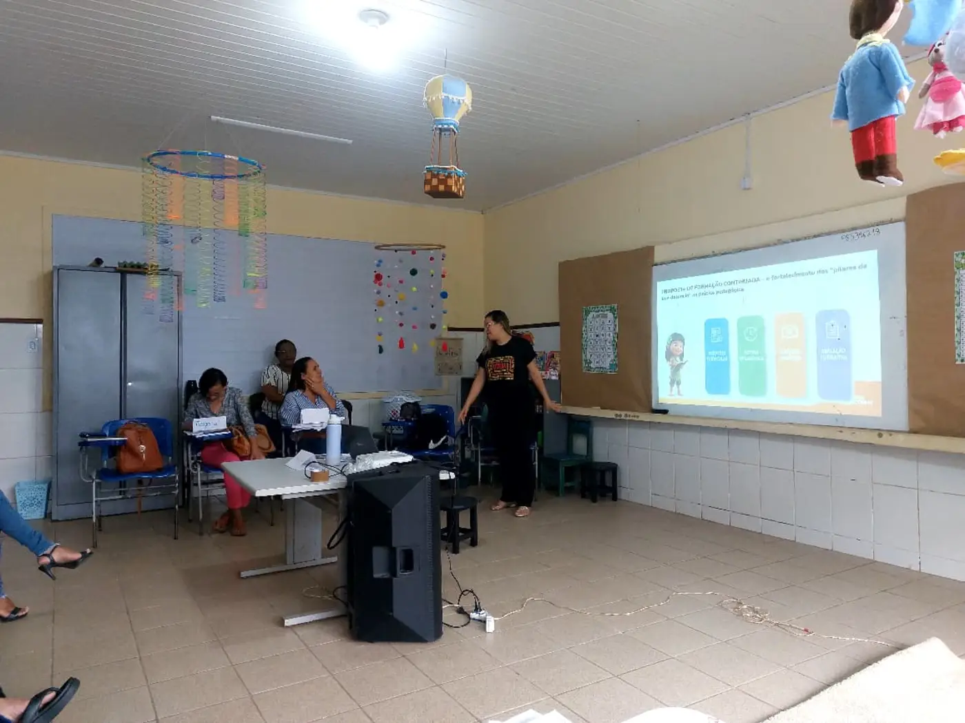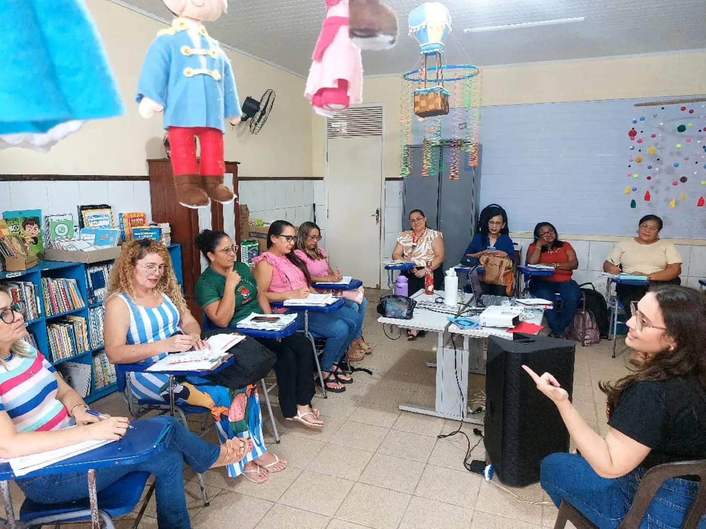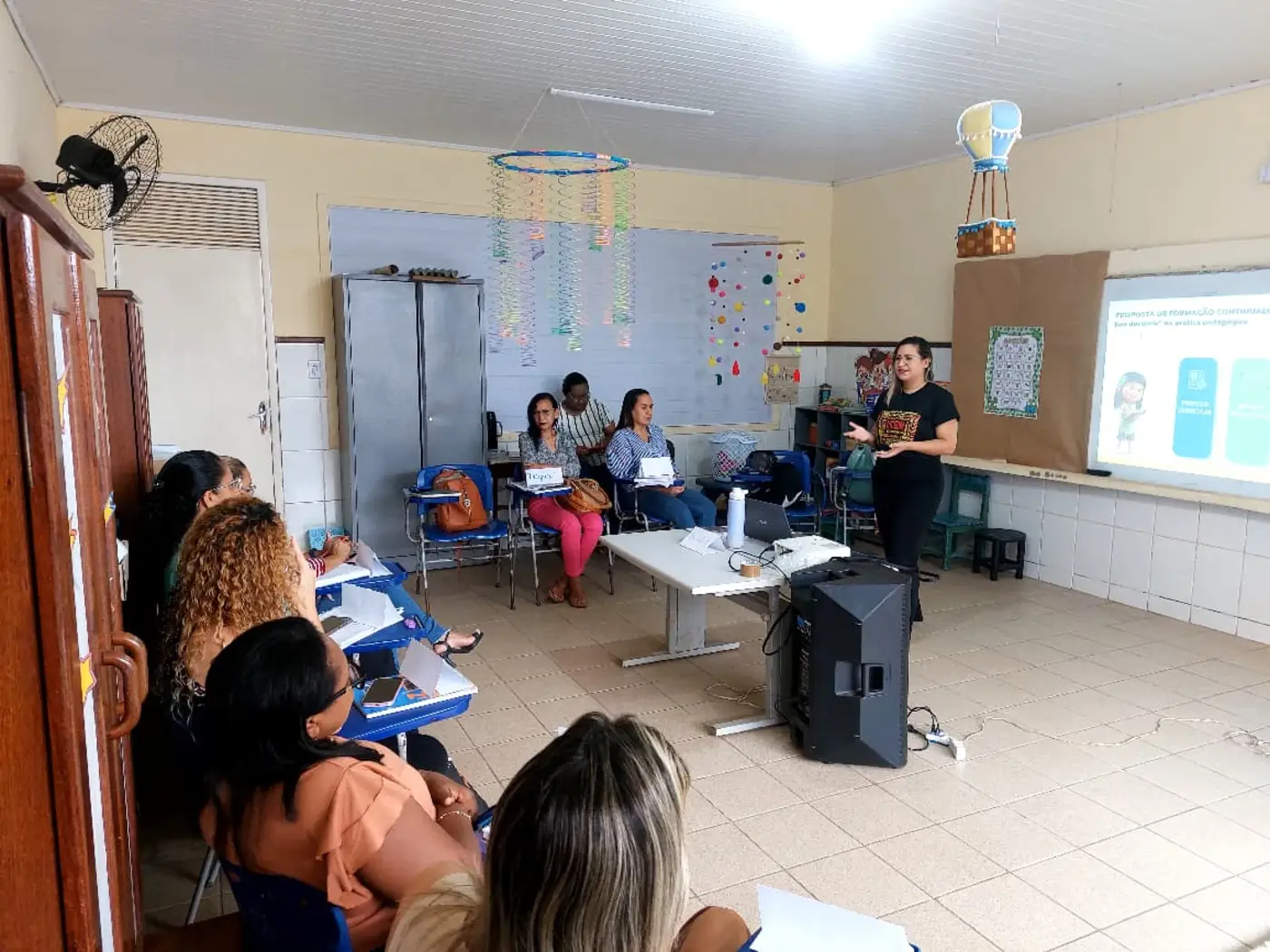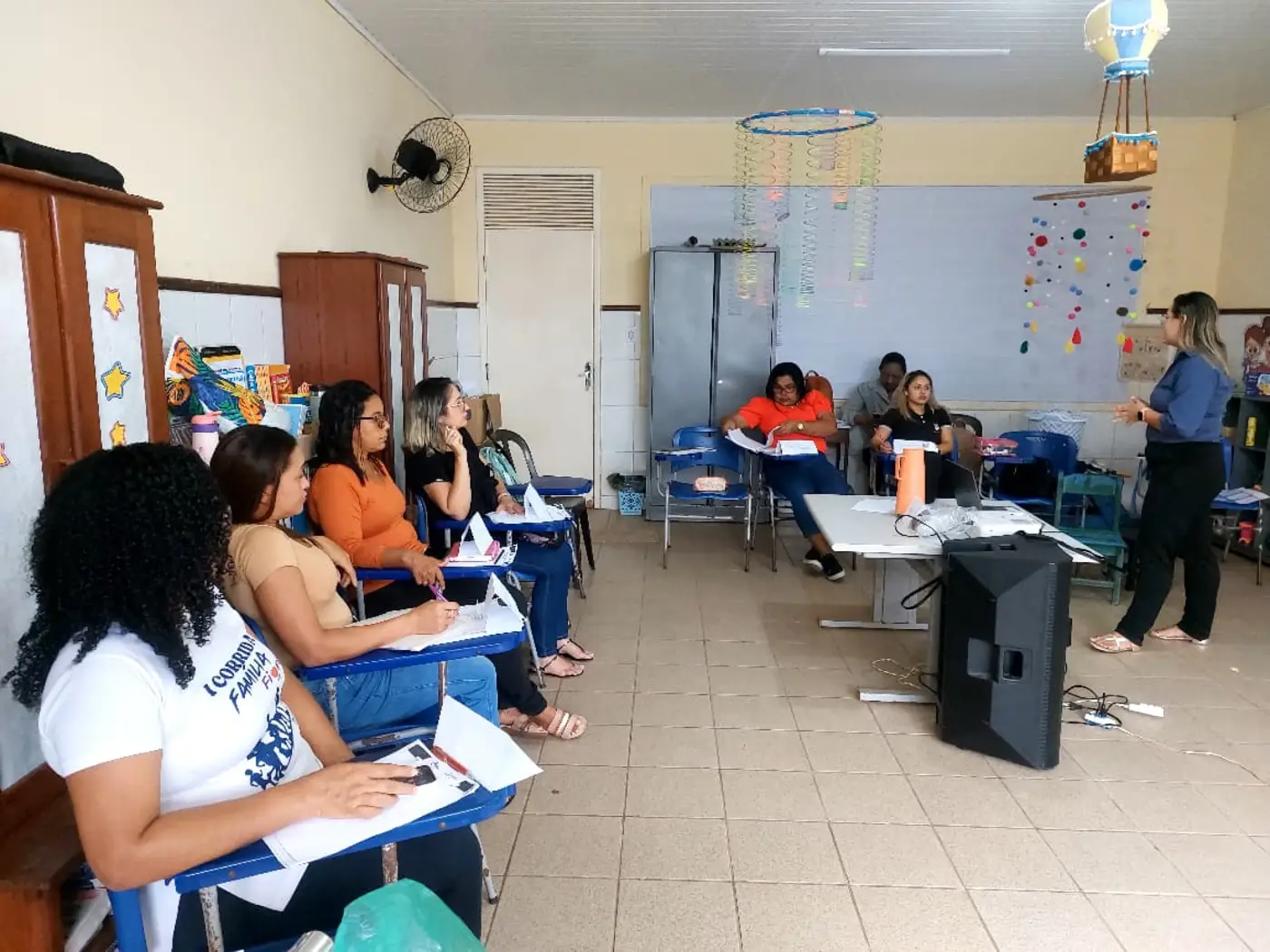 As formadoras abordaram temas a respeito da Educação Antirracista, evidenciando a relevância de trabalhar os conteúdos em sala de aula numa perspectiva de combate ao preconceito étnico-racial, fortalecendo o respeito e a empatia no cotidiano das crianças, a fim de formar indivíduos que praticam a equidade entre seus pares.
