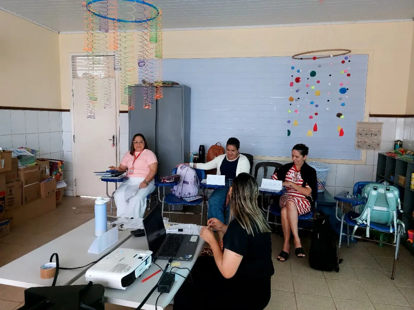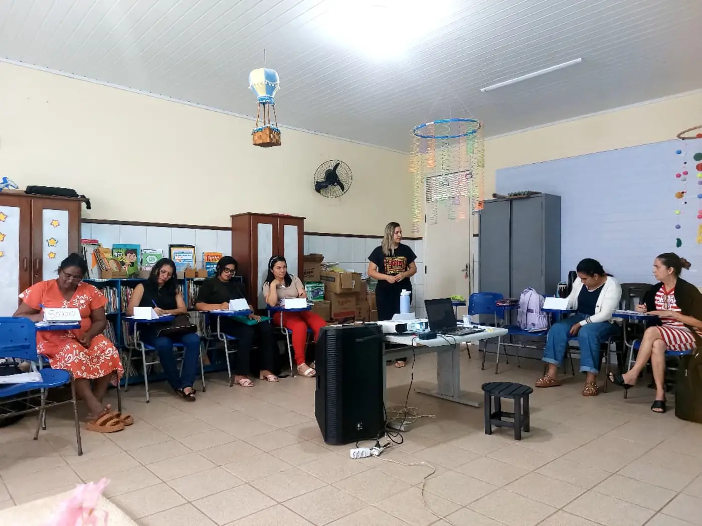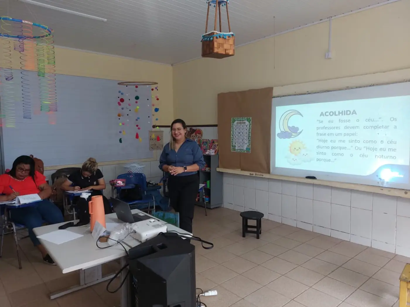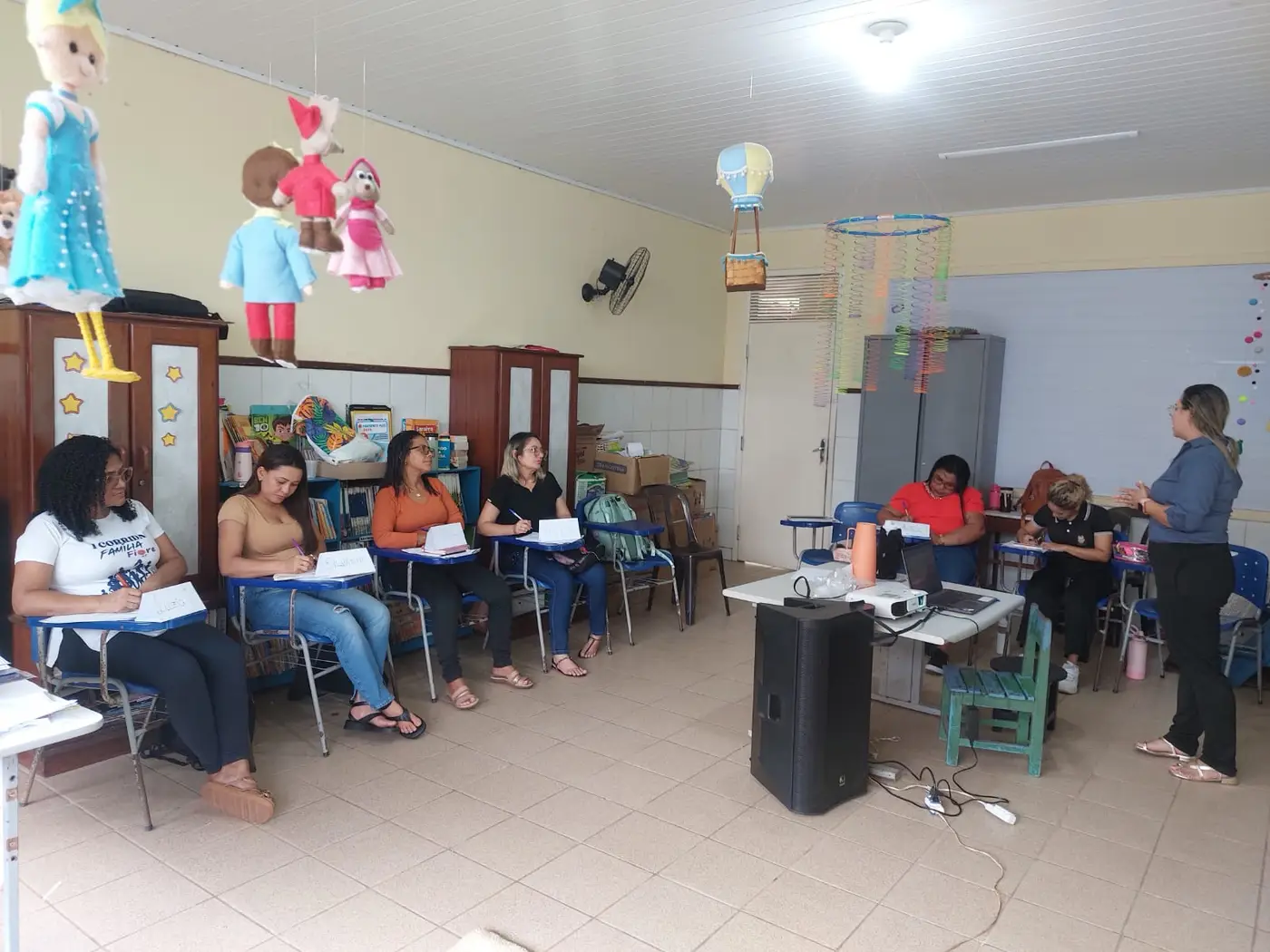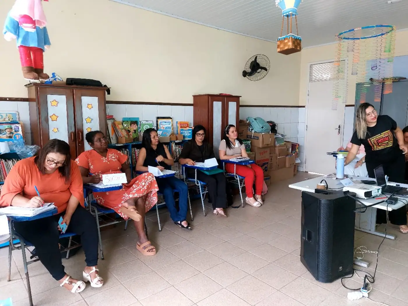 As formadoras abordaram temas a respeito da Educação Antirracista, evidenciando a relevância de trabalhar os conteúdos em sala de aula numa perspectiva de combate ao preconceito étnico-racial, fortalecendo o respeito e a empatia no cotidiano das crianças, a fim de formar indivíduos que praticam a equidade entre seus pares.