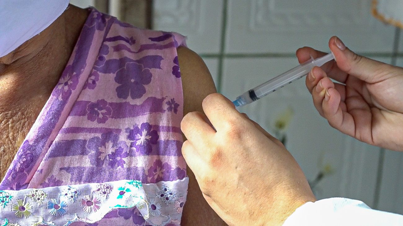 Joana de Freitas Leal, de 98 anos, foi a primeira idosa do município de Benevides à receber a vacina contra a covid-19.