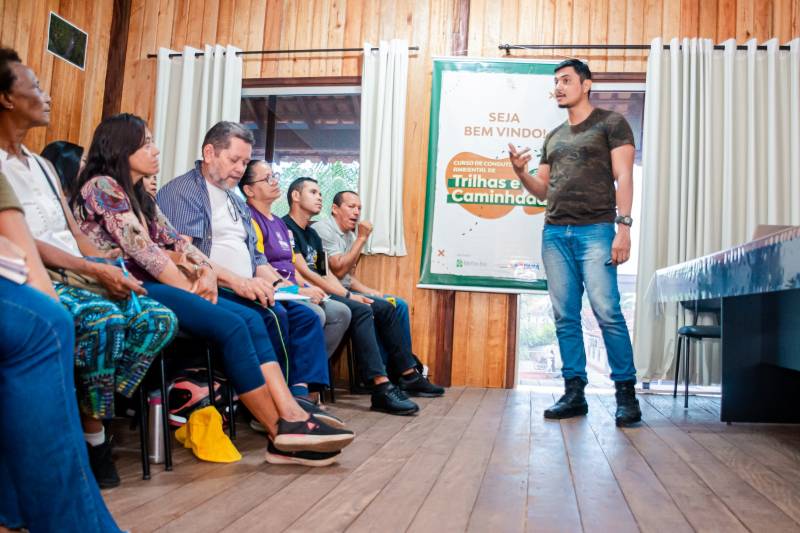 Teve início na segunda-feira, 25, o curso Condutor Ambiental de Trilhas e Caminhadas, mais um investimento da Prefeitura de Benevides na capacitação dos benevidenses e no cuidado com o meio ambiente. O curso, com duração de duas semanas, está sob coordenação da Secretaria Municipal de Meio Ambiente e Turismo - Semmat, em uma Parceria com o governo do Pará, por meio da Secretaria de Estado de Turismo, Ideflor-Bio e Corpo de Bombeiros. Na primeira parte, os alunos adquirem conhecimentos básicos sobre as Unidades de Conservação - o que são e como estão divididas e distribuídas - segurança, legislação, nós, amarrações e até noções de atendimento hospitalar. A parte prática será realizada na trilha do Pinheiral, na estrada do Taiassuí. As aulas estão sendo conduzidas pelo engenheiro ambiental Diego Barros.