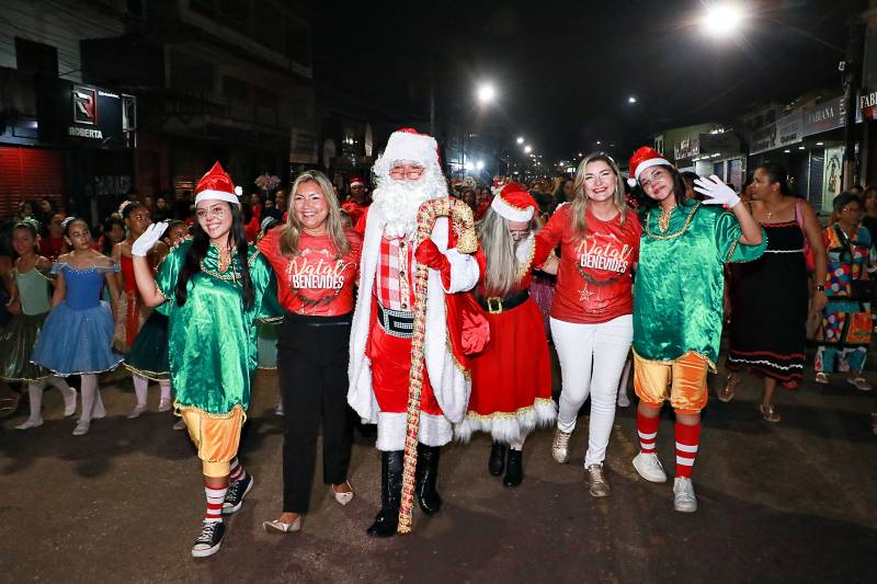 A cerimônia começou com o acender das luzes natalinas em frente à sede da Prefeitura Municipal, seguido por um animado cortejo natalino até o Ginásio Nagibão, onde foi inaugurada a Vila Natalina.