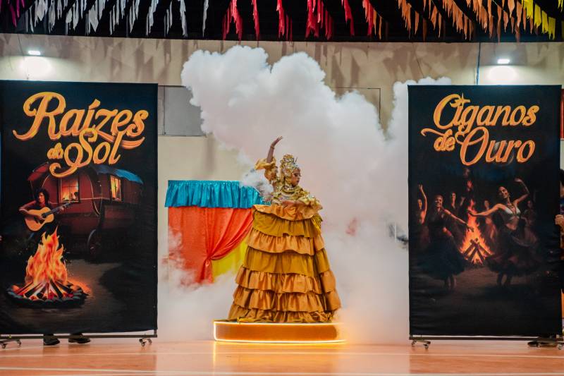 A abertura ficou por conta da quadrilha Raízes do Sol, de Castanhal, que trouxe ao palco o tema “Ciganos de Ouro”.