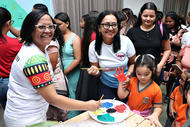 Nó final do evento, as crianças carimbaram com as próprias mãozinhas a árvore pintada no interior do auditório do Centro de Formação e Pesquisa, representando os frutos e a integração criança/meio ambiente